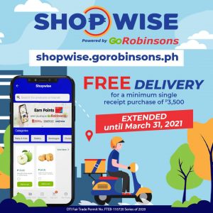 Enjoy FREE Delivery when you purchase a minimum of PHP3,500 at Shopwise in GoRobinsons Online Grocery Delivery! Share the good news now to your family and friends and shop online ANYTIME only at Shopwise – GoRobinsons website or mobile app. Hassle-free shopping indeed!