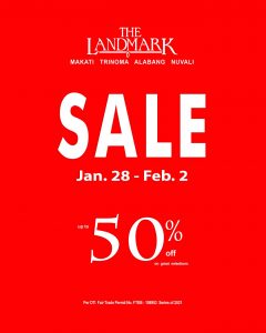 Score items up to 50% OFF when you shop in Landmark Makati, Trinoma, Alabang and Nuvali branches from January 28 to February 2. See you!