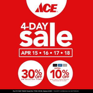 Visit ACE Hardware’s 4-Day Sale on April 15-18. Up to 30% OFF on specials. EXTRA 10% OFF for a min. spend of P3K when using your ACE Rewards, SMAC, Prestige & BDO Rewards cards. PLUS 5% OFF for a min. spend of P5K using your BDO credit cards in SM malls only from April 16-18. T&Cs apply. DTI#116120