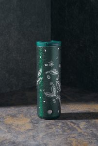 Starbucks’ newest Coffee & Tea 16oz. stainless steel tumbler comes in a sleek green color featuring a classic coffee leaves and beans artwork.