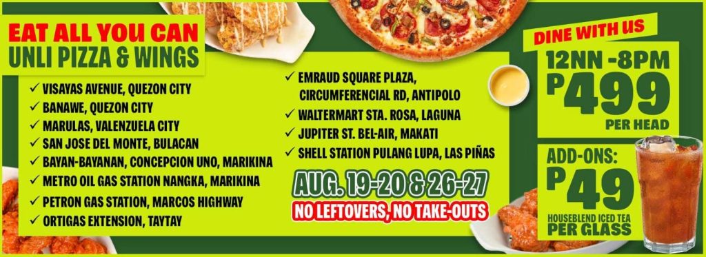 Select stores only P499 for eat all you can on bestselling pizzas and truffle, buffalo or bbq flavored chicken wings!